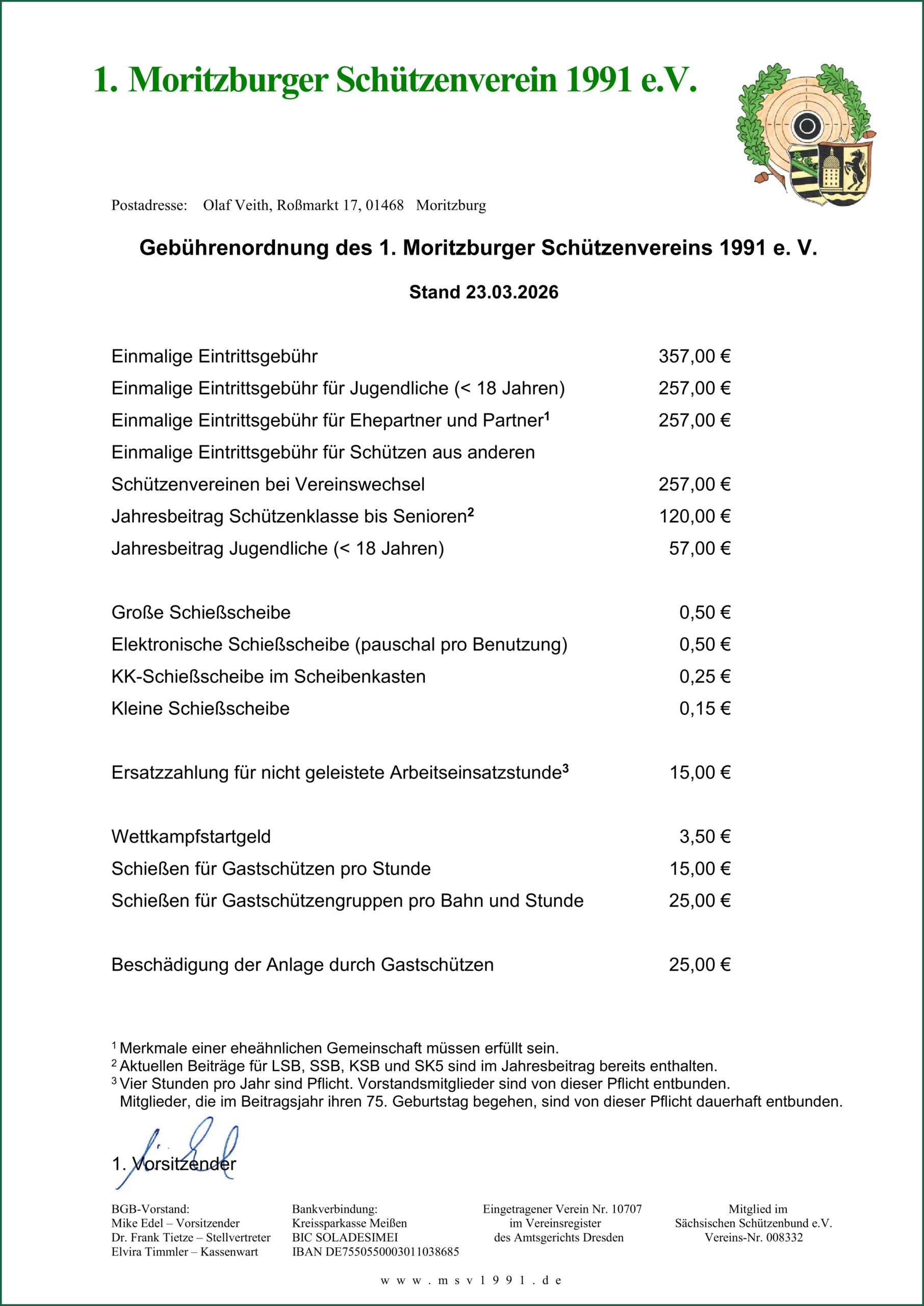 Gebührenordnung des 1. Moritzburger Schützenvereins 1991 e.V.